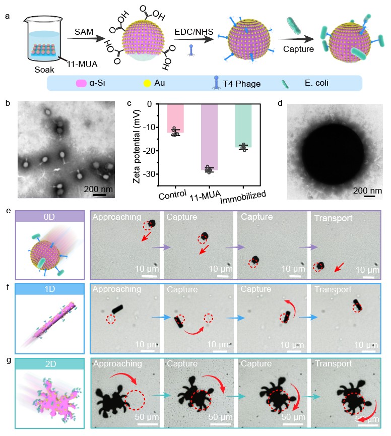 研究团队利用PECVD技术在各类模板结构上沉积非晶硅薄膜,构建出一系列结构可编程的硅基微机器人,包括0D球形结构、1D纳米棒结构、2D图案结构以及3D纳米树结构。在此基础上,通过在微机器人表面进一步修饰噬菌体,使其具备对特定细菌的识别能力,从而实现对目标细菌的主动捕获。以球形结构为模板,通过PECVD沉积形成Si壳层,并在其表面沉积金纳米结构,构建Si/Au结,从而形成具有Janus结构的0D微机器人。在光照条件下,由于光电化学反应,在微机器人周围形成离子浓度梯度,基于自扩散泳的驱动机制,使微机器人能够在光照下实现高效运动。