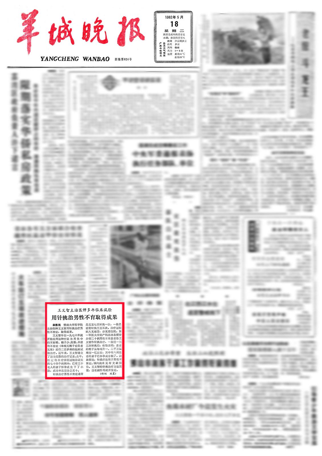 岭南陈氏针挑法与羊城晚报的渊源,早在44年前就已结下。1982年5月18日,羊城晚报头版刊发《王义智主治医师多年临床试验 用针挑治男性不育取得成果》,独家报道了这项中西医结合技艺的诊疗成果,在全国引发强烈轰动。